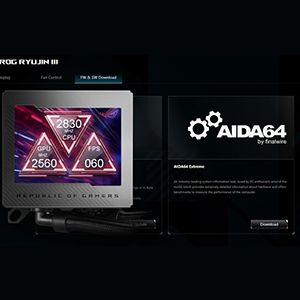 ايدا 64 اكـستريميأتي روج ريوجين III ARGB أيضًا مع اشتراك لمدة عام واحد في AIDA 64 Extreme، والذي يمكن توصيل بياناته مباشرة على شاشة LCD للمبرد للحصول على مزيد من المعلومات حول حالة نظامك.