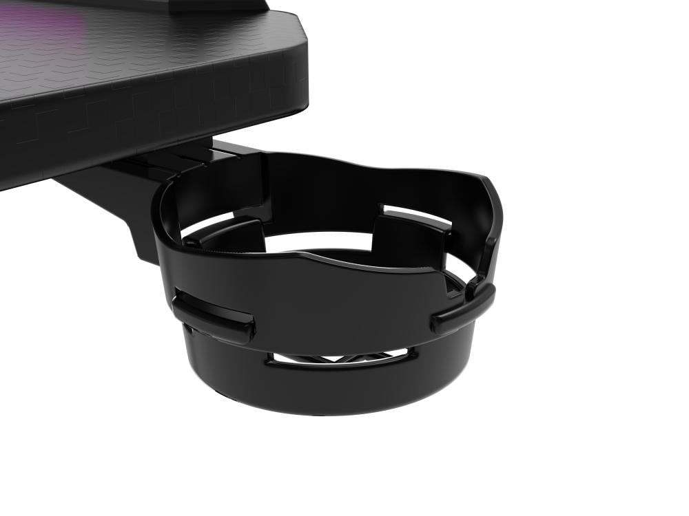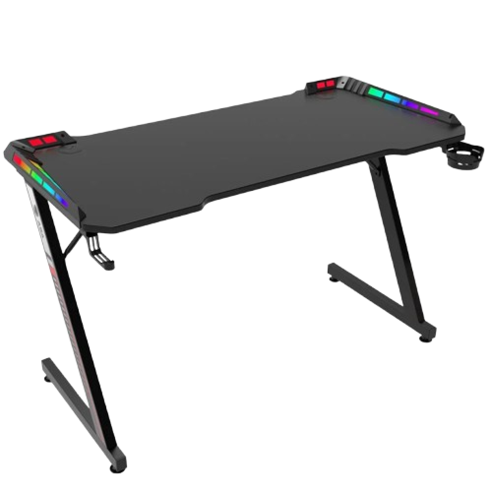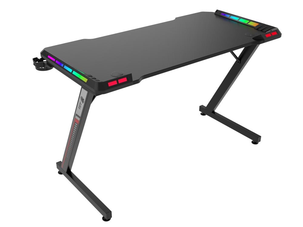 طاولة قيمنق بتصميم مميز و سطح بتصميم كاربون فايبر وحامل كوب وحامل سماعة ومنظم اسلاك واضاءة RGB.
